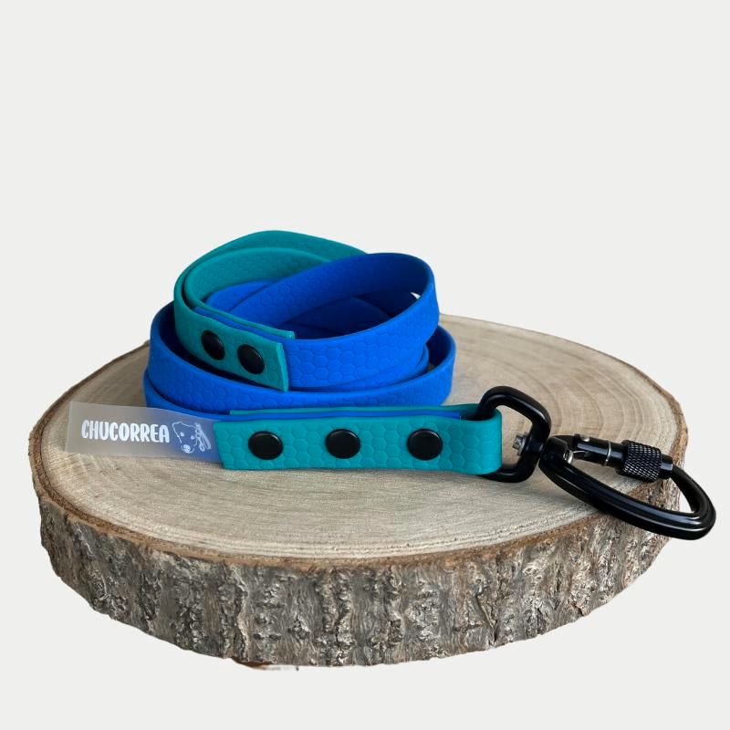 La Chucorrea Bicolor de PVC azul oscuro y detalles en sus extremos en color verde pastel combina resistencia y estilo para paseos cómodos y seguros con tu perro. Con un ancho de 20 mm y longitud de 3 metros, es ideal para perros grandes. Su diseño incluye: