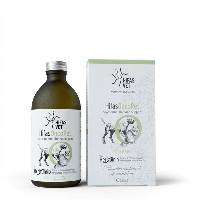 Hifas Onco Pet es un suplemento natural para perros y gatos que apoya el sistema inmunológico y el equilibrio metabólico, ayudando al bienestar general durante procesos de estrés o tratamientos veterinarios.